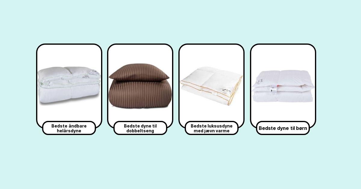 Bedste dyne til svedige nætter er en høj-bæreevne sommerdyne (gås eller top-moskus) med lav fyldvægt, meget åndbart vår og eventuelt kombineret med bambus- eller hørbetræk. Bedste budgetdyne er en andedunsdyne med dokumenteret bæreevne 10-12, kassettesyet og 90% dun, hvor du får mest for pengene. Bedste allergivenlige valg er en NOMITE-mærket dyne, vaskbar ved 60°C, med Oeko-Tex og Downafresh, uanset dunart – her er hygiejnen vigtigere end arten. Bedste dobbeltdyne til par er en let, høj-bæreevne moskus- eller gåsedunsdyne med moderat fyldvægt, så den ikke bliver for varm, men stadig dækker to personer komfortabelt.