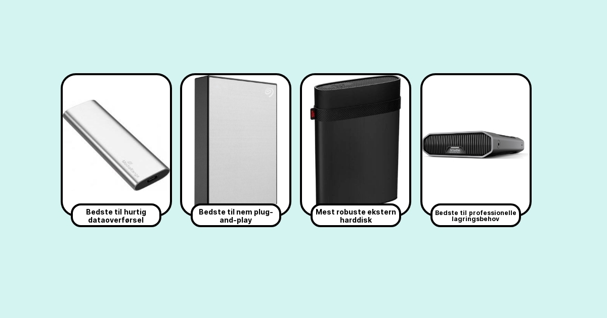 Her får du de 7 bedste eksterne harddiske lige nu – fra kompakte rejsemodeller til stille desktop-arbejdsheste – med klare anbefalinger alt efter om du jagter kapacitet, pris, driftssikkerhed eller mest mulig hastighed.