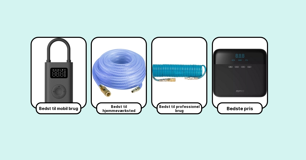 Her er de 7 bedste luftkompressorer, jeg med ro i maven kan anbefale: fra den stille til garagen, den mobile til bilen og den rå kraft til trykluftværktøj. Kort sagt: din næste kompressor – uanset behov og budget.