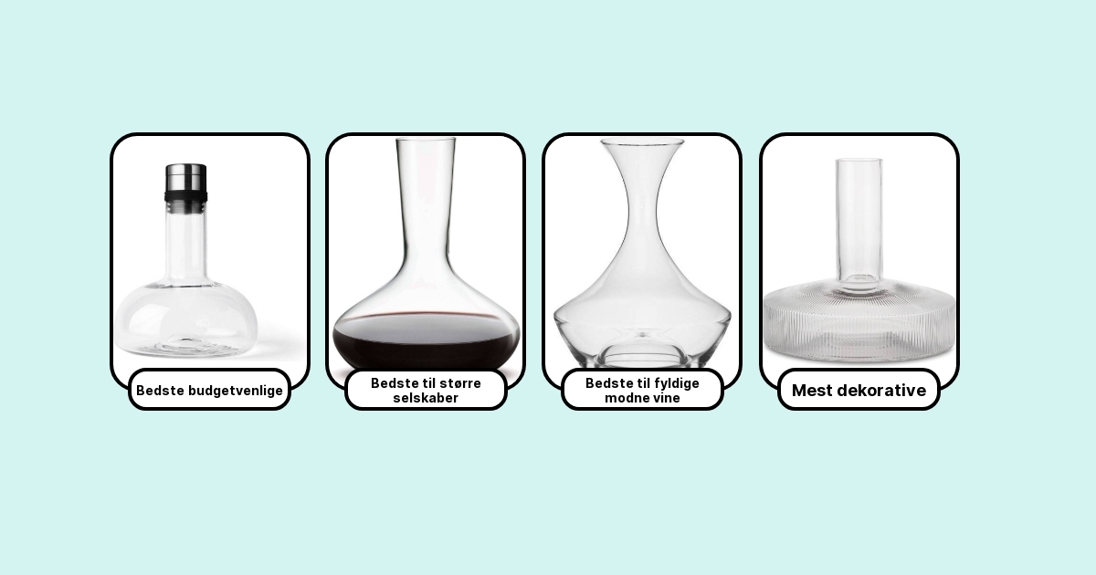 Riedel Amadeo: Ikonisk S-formet skulptur, der hælder som smør i begge retninger. Den er dyr og kræver lidt omhu ved rengøring, men som præsentations- og performance-karaffel til kraftige rødvine er den svær at slå. Showpiece med reel funktion.