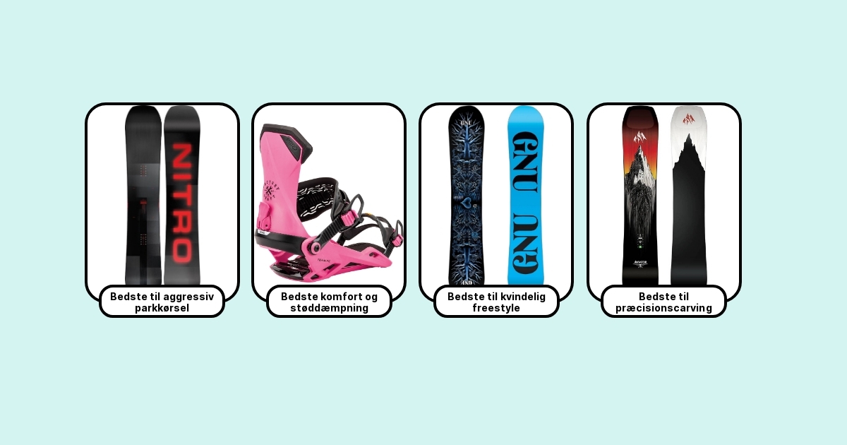 Ride Warpig er den korte, brede sjovmaskine, der samtidig carver overraskende hårdt og gør dårlige dage gode. Nitro Squash er min pudder- og carving-darling: directional shape, masser af løft og en carve-følelse, der lokker til lange, rene spor. Korua Pencil er ren surf på pisten og i sidecountry – enkelt, smukt og vanedannende i lange sving. Salomon Huck Knife er parkens pålidelige arbejdshest med nok backbone til at være dit daglige board på pisten.