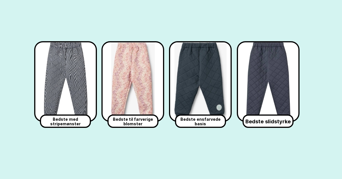 Se også efter solide syninger, ekstra bartacks ved stresspunkter og en inderside, der ikke tråder op efter vask. Reima, En Fant og Wheat gør det konsekvent godt her, mens de billigere mærker har forbedret sig meget de seneste år og i dag leverer glimrende holdbarhed til prisen.